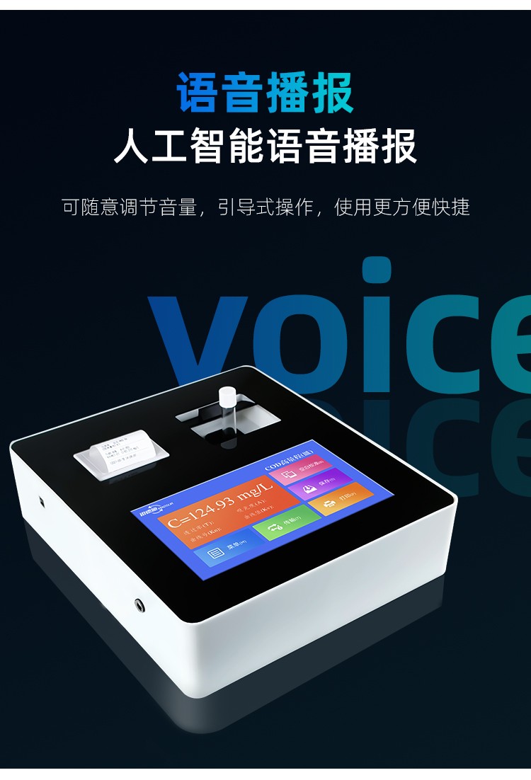 人工智能語音播報提示,可隨意調節音量, 使用更方便更 配備112種預先編程的曲線,曲線數量990條,可濃度直讀,測量結果更精密; 具有數據存儲功能,可存儲90萬組數據,并能自由查看; 10寸彩色液晶顯示觸摸屏,全中文操作模式,更便于操作掌握; 儀器自備校準功能,可根據標準樣品計算, 并存儲曲線,無需手動制作曲線; 配備USB接口傳輸功能,自帶打印機,可打印當前數據及存儲的歷史數據; 采用管比色、皿比色,雙比色系統